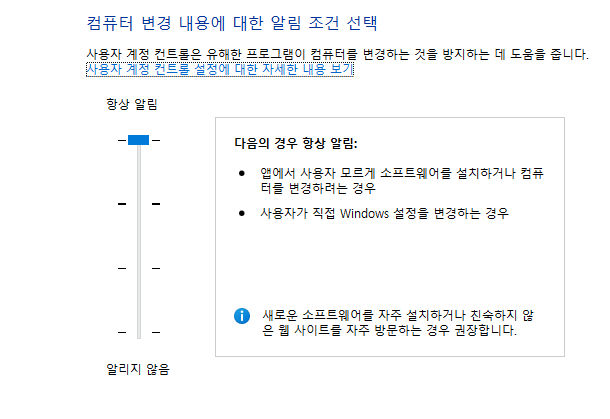 제어판 - 시스템 및 보안 - 사용자 계정 컨트롤 설정 변경(관리자 권한)